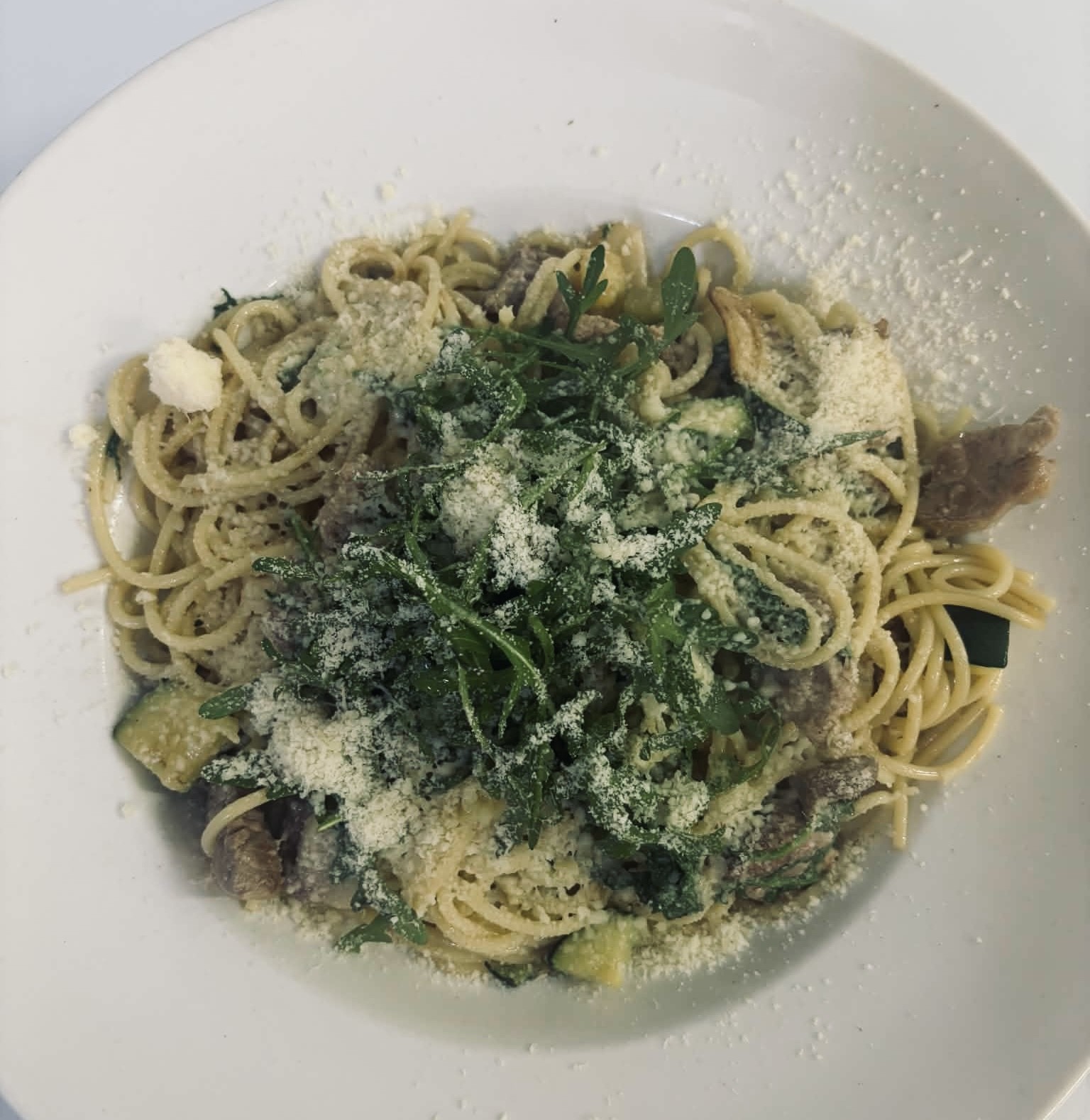 vepřová panenka, česnek, rukola, cuketa, petrželka, italský sýr - lehce pálivé