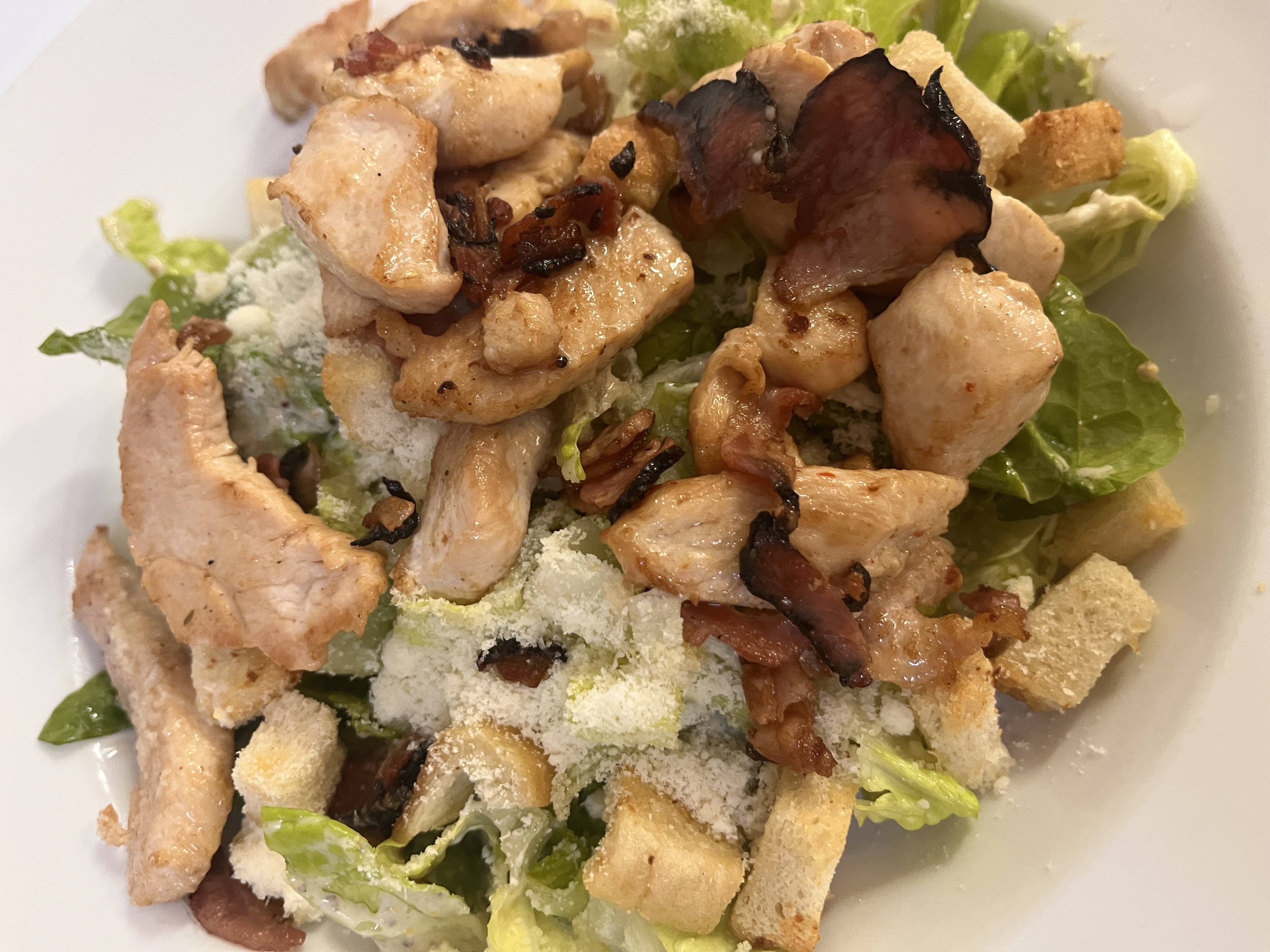 římský salát, grilovaná kuřecí prsa, česnekové krutony, italský sýr, domácí dresing