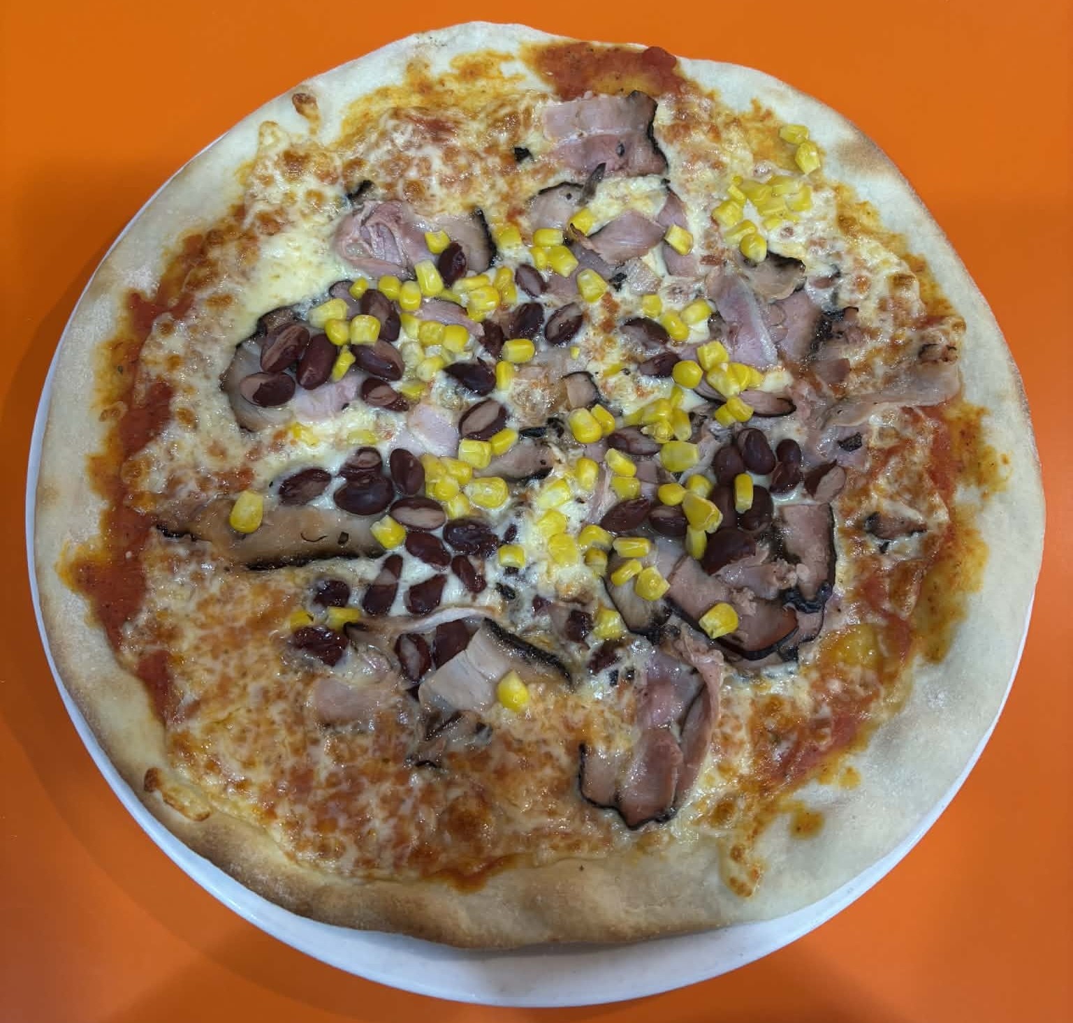 rajčatová omáčka, mozzarella, chilli fazole, anglická slanina, kukuřice