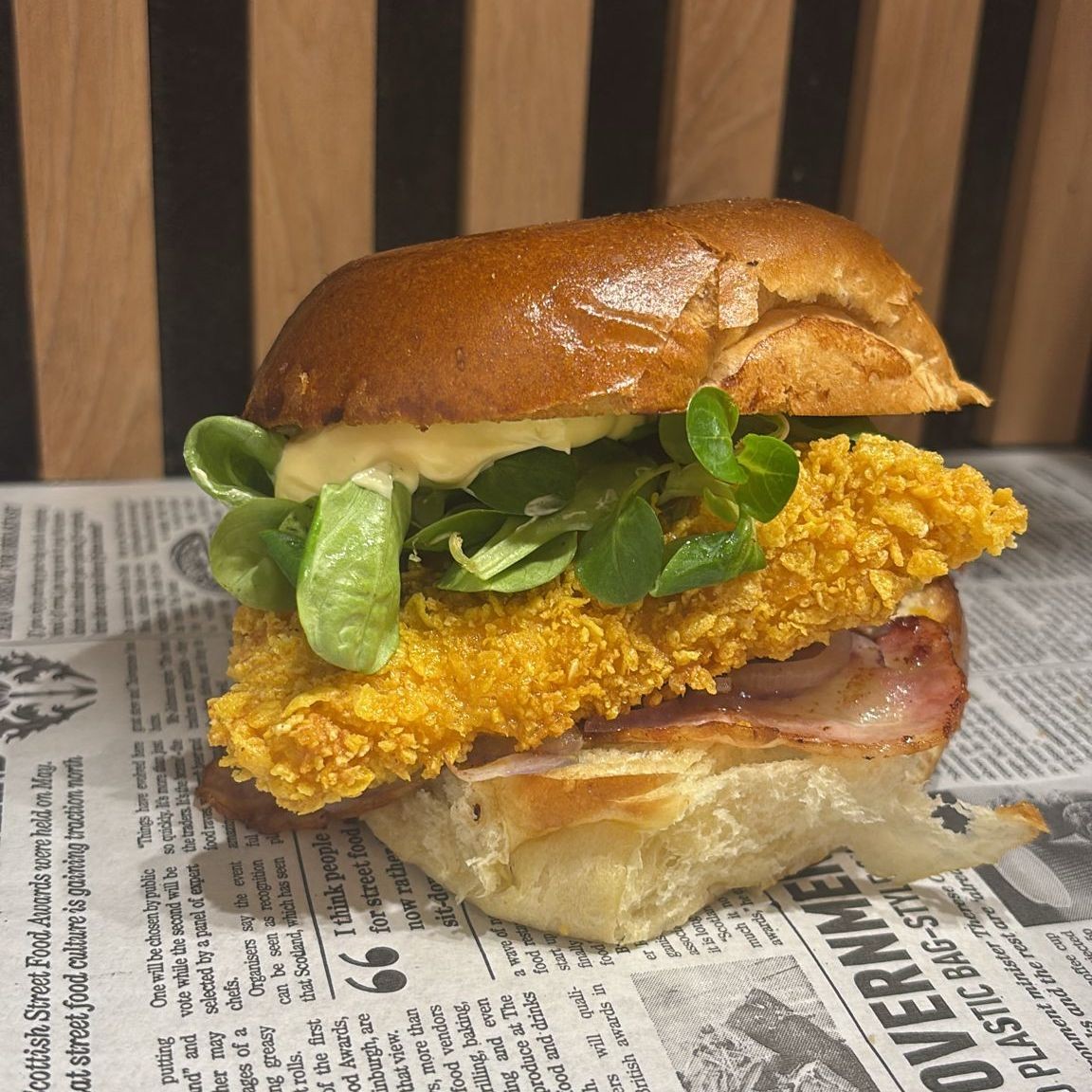 Bulka, 100g kuřecího masa obaleného v cornflakes, omáčka dle výběru, grilovaná cibulka, slanina, polníček