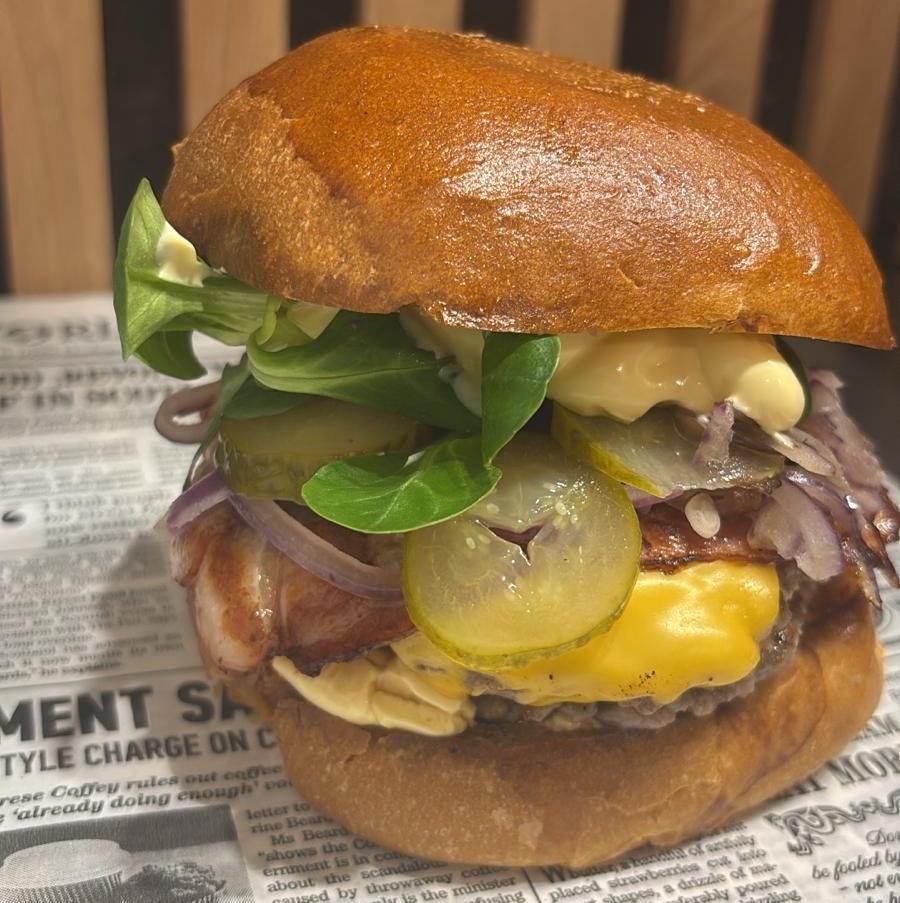 Bulka, 2x 100g mleté hovězí maso, omáčka dle výběru, grilovaná cibule, 2x slanina, plátkový cheddar, nakládaná okurka, polníček